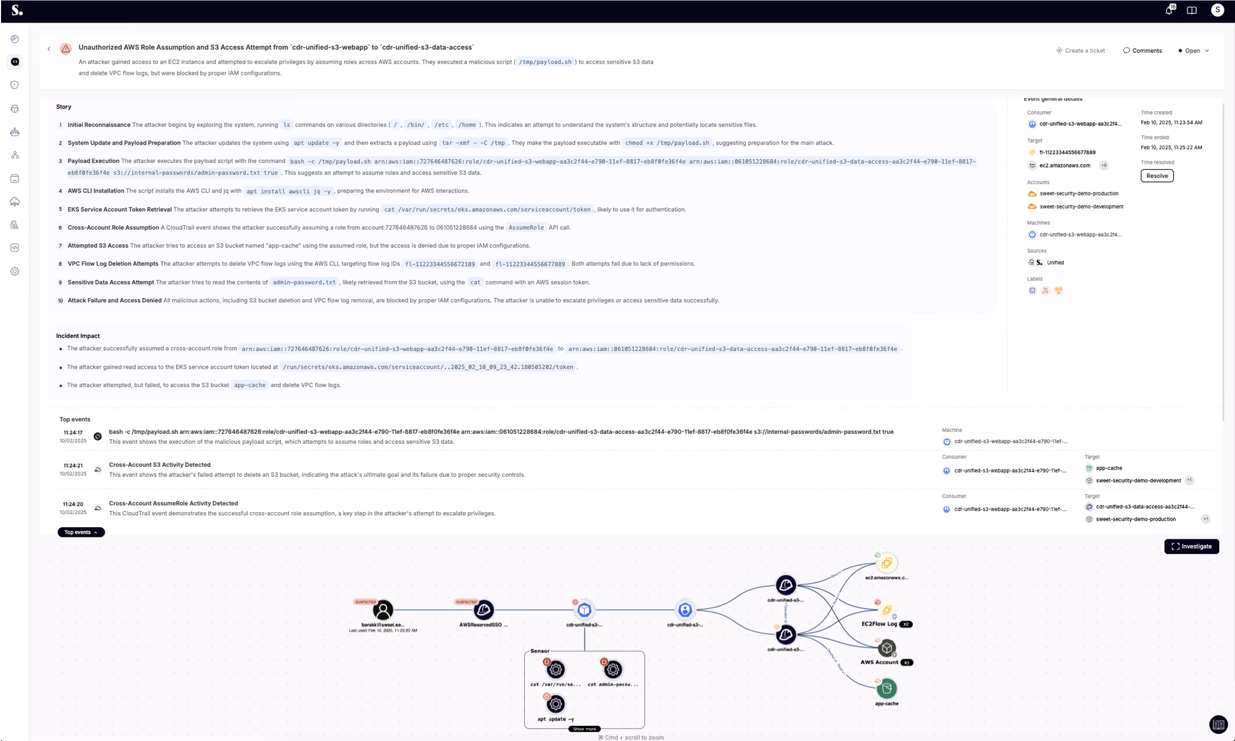 Sweet Security's AI-generated Storyline maps all the activity that took place in an incident into a clear, ordered sequence— transforming raw security data into an understandable narrative. Designed for human readability, it quickly helps you determine if an incident is a false positive and identifies who on the development or security team needs to take action.