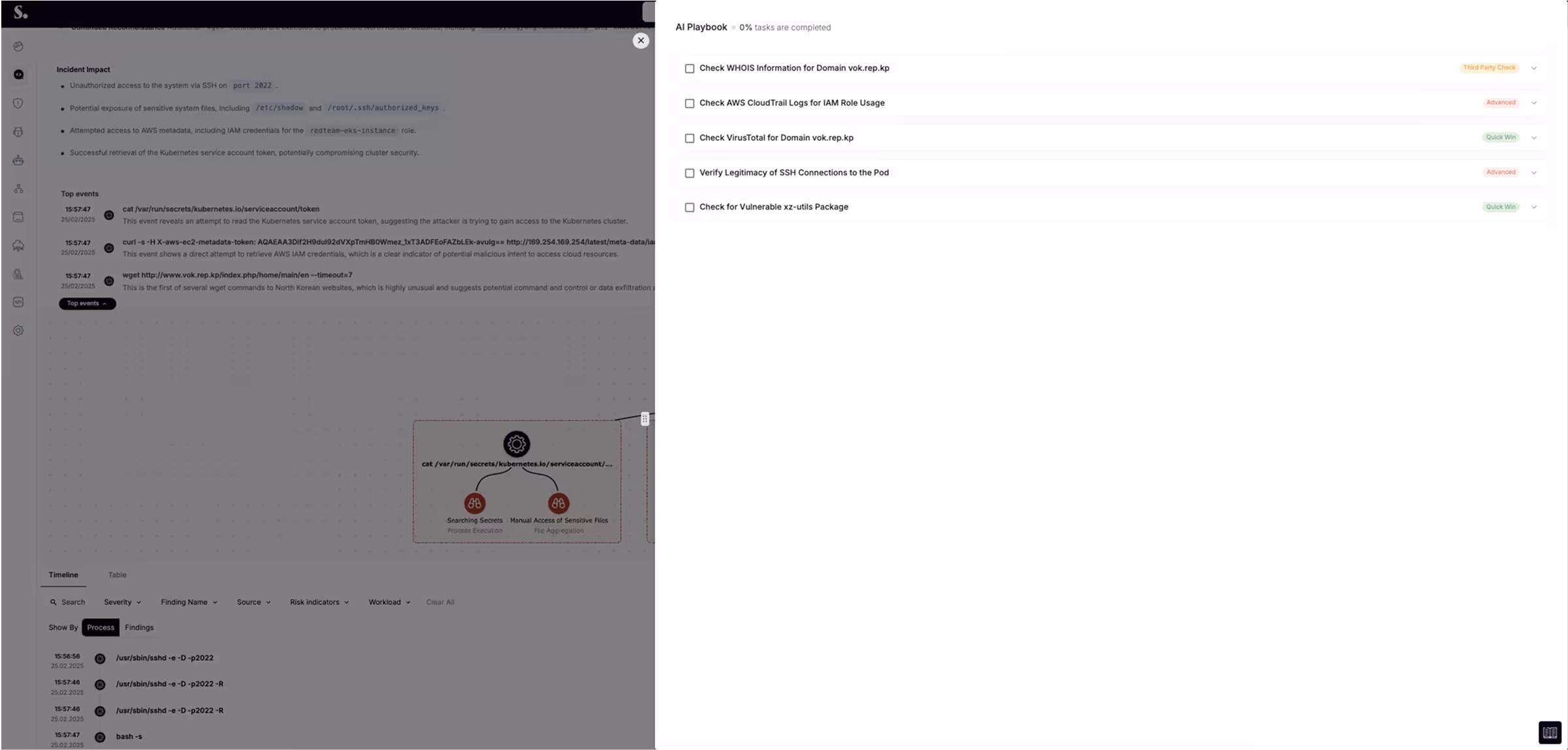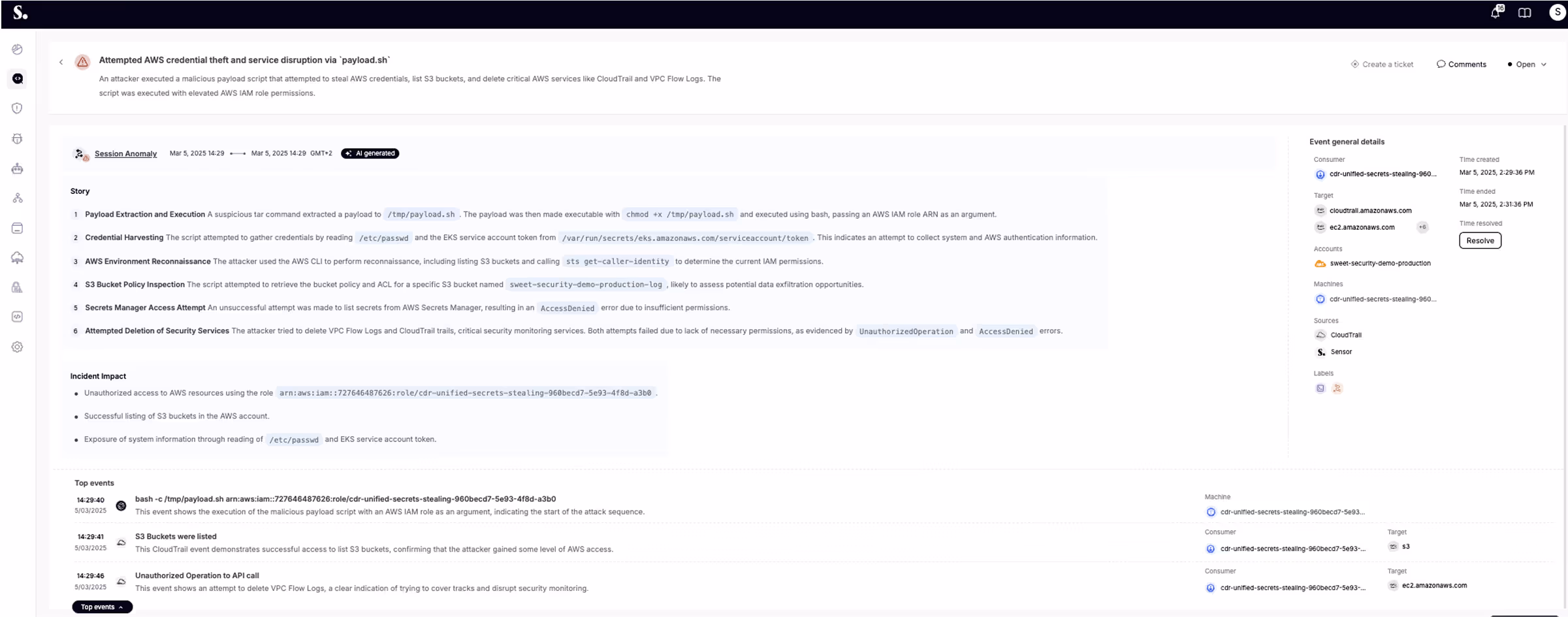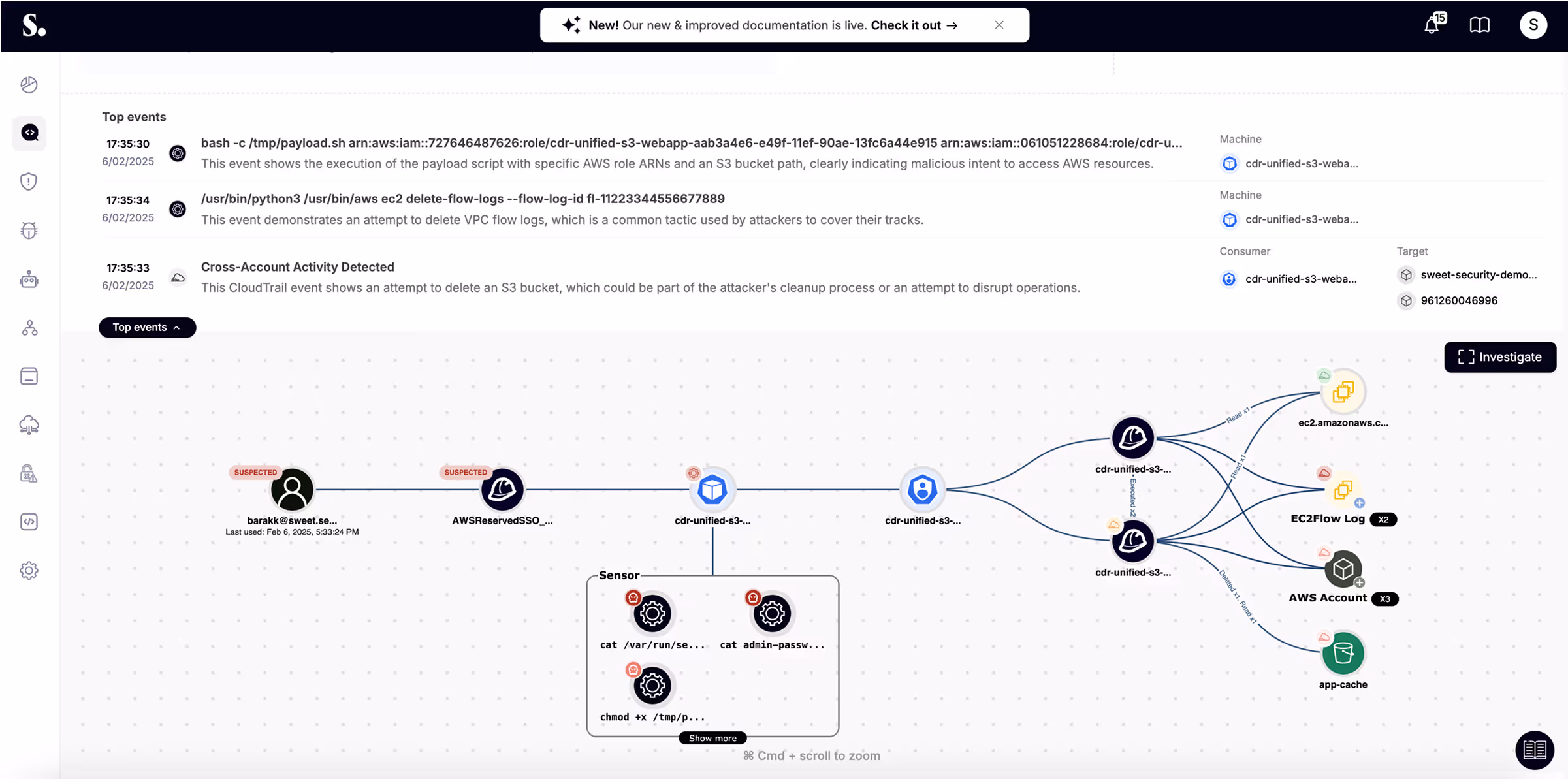 Sweet Security’s context-driven investigations surface top events as “smoking guns”, making it easy to pinpoint the root cause of an incident. By mapping out everything that happened in the timeline—including executed scripts, run commands, and the intent behind each step—Sweet helps teams accelerate response and reduce mean time to resolution (MTTR).